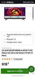 65 pollici completa di scontrino LG UR73006LA Risoluzione Real 4K: Guardare un TV 4K significa guardare immagini con una risoluzione quattro volte più alta rispetto al Full HD: una definizione straordinaria che donerà ai tuoi contenuti un realismo ancora maggiore. Il Real 4K di LG ti assicura una resa eccezionale dei colori, con sfumature morbide e precise grazie al pannello che visualizza ben 1 miliardo di colori. La tecnologia HDR10 Pro, inoltre, dona ai contenuti compatibili una profondità di colore ancora più elevata. Processore a5 Gen6: Il nuovo processore a5 Gen6 migliora i contenuti che guardi sul TV attraverso un'accurata elaborazione delle immagini e del suono. Per le immagini, il processore trasforma in 4K anche i contenuti a una risoluzione inferiore e controlla la luminosità dello schermo applicando dei sofisticati algoritmi basati sull'Intelligenza Artificiale. Per il suono, la funzione AI Sound riconosce cosa stai riproducendo e adatta di conseguenza la resa audio. Smart TV con ThinQ AI e webOS 23: Questo TV è davvero intelligente, perché integra l'assistente ThinQ AI che ti consiglia cosa vedere in base alle tue abitudini. Grazie alla piattaforma smart TV webOS 23 trovi tutti ancora più rapidamente, grazie alle schede tematiche accessibili direttamente dalla schermata principale. Inoltre, trovi tantissimi servizi di streaming per non perderti le serie TV e i film più chiacchierati del momento. Tante piattaforme di streaming a disposizione: Per le tue maratone film o serie TV non hai che l'imbarazzo della scelta fra i tantissimi servizi di streaming che trovi sulla piattaforma smart webOS di LG. Con Netflix, Disney+, Amazon Prime, Apple TV+, RaiPlay, Rakuten TV, NOW e molte altre ancora avrai sempre qualcosa di straordinario da guardare.