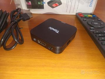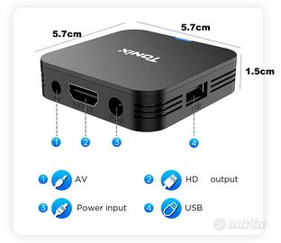 Vendo TV Box Mini Tanix, perfettamente funzionante, con telecomando, cavo hdmi, cavetto alimentazione (da collegare a un caricatore usb o direttamente alla tv usb) molto piccolo misura solo 5,7 x 5,7 x 1,5.