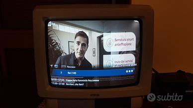 14 P2 Marca Mivar tv a colori con una presa peritelevisione SCART, presa antenna esterna (inclusa antenna orientabile a doppio stelo) tv colore grigio chiaro (necessita di decoder terrestre o parabola per poter vedere i canali in chiaro o paytv ) usato ma ben conservato la coda è slim si può usare anche in una piccola cucina o potrebbe esser utile per console videogiochi vintage poichè la visione è in 4/3