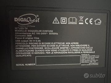 Vendo TV Digiquest 32 pollici modello DGQ32DLHR, in condizioni pari al nuovo. Utilizzata esclusivamente durante la stagione estiva in casa al mare, quindi con un utilizzo molto limitato nel tempo. La TV è perfettamente funzionante, priva di difetti, graffi o problemi di visione. ✔ Schermo 32” ✔ Telecomando originale incluso e funzionante ✔ Ottima qualità video per uso quotidiano ✔ Possibilità di collegare dispositivi esterni come Sky, Amazon Fire Stick, Google Chromecast ✔ Ideale per seconda casa, camera da letto o cucina Non dispongo della scatola originale. Prezzo leggermente trattabile.