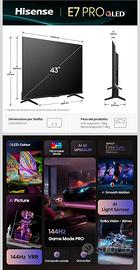 Vendo splendida TV Hisense 43E7Q PRO da 43 pollici, NUOVA SIGILLATA, MAI UTILIZZATA. TV 144Hz ideale per Dolby Vision, Gaming PS5/Xbox. 🔹 Schermo QLED 4K Ultra HD (immagini super definite e colori brillanti) 🔹 Frequenza 144Hz Game Mode PRO (perfetta per gaming PS5/Xbox) 🔹 Dolby Vision IQ + HDR10+ Adaptive 🔹 Audio Dolby Atmos 🔹 Smart TV VIDAA con Netflix, Prime Video, YouTube ecc. 🔹 Wi-Fi + Alexa integrata 👉 Ottima sia per film che per gaming grazie alla fluidità elevata. 📦 Acquistata su Amazon, vendo poiché doppione di un regalo. 💰 Prezzo: 320€. Prezzo di listino su Amazon 430€ 📍 Consegna a mano in zona [Mentana/monterotondo/Roma]o spedizione a carico dell’acquirente. Allego foto scatola sigillata e modello tv