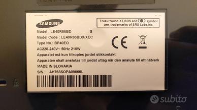 TV LCD 40 pollici Samsung LE-40R86BD con telecomando compatibile (non originale) perfettamente funzionante. Dimensioni diagonale schermo: 101,6 cm (40") Risoluzione del display: 1366 x 768 Pixel Tipologia HD: HD Tecnologia display: LCD Luminosità schermo: 550 cd/m² Tempo di risposta: 8 ms Rapporto d'aspetto nativo: 16:9 Base: girevole / rotante 20° Montaggio a parete VESA: 200 x 200, 400 x 200, 400 x 400 Connettività: PC in (D-Sub), video YPbPr/YCbCr in, video composito, Uscita (L, R) audio, uscita audio digitale ottico, uscite per cuffie, porta RS-232, 2x prese Scart, porta RF, S-Video in, 3x porte HDMI. Audio: 2x altoparlanti, potenza in uscita (RMS): 20 W, sistema audio A2/NiCAM, SRS Trusurround. Sintonizzatore TV: analogico e digitale (NO digitale terrestre).