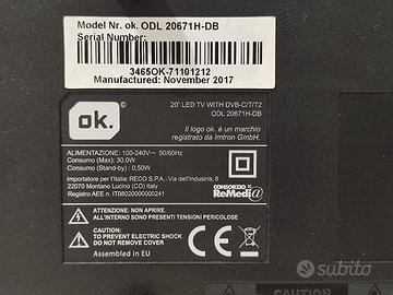 Vendo TV marca OK (media world). modello ODL-20671H-DB da 20 pollici (no smart), perfettamente funzionante, completo di telecomando originale.