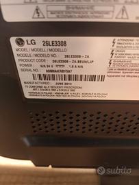 LG 26LE3308. Dimensioni schermo: 66 cm (26"), Risoluzione del display: 1366 x 768 Pixel, Tipologia HD: HD, Tecnologia di interpolazione del movimento: TruMotion 100 Hz, Rapporto d'aspetto nativo: 16:9. Telecomando incluso. Perfetto, non occorre il decodere in quanto gia' nel tv. Disponibile a qualsiasi test, non spedisco.