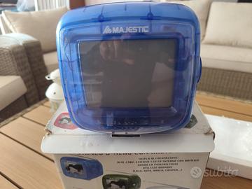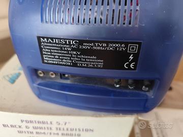 Vendo televisore portatile da 5,7” mod. TVB 2000.6 bianco e nero marca Majestic con radio AM/FM, tripla alimentazione: 12V (auto/camper), pile (tipo UM-2) e 220V (con alimentatore incluso). Conservato nel suo involucro originale Prezzo richiesto 23,00 euro