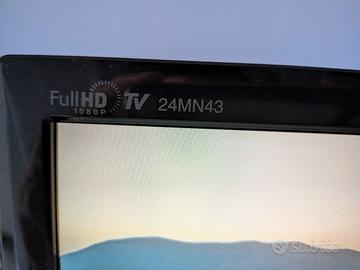 TV monitor LG 24MN43 FULL HD. Perfettamente funzionante ma ha bisogno di un decoder per la TV (non incluso). È incluso invece il telecomando. Base difettosa, non può essere inclinato a piacimento perché cade.