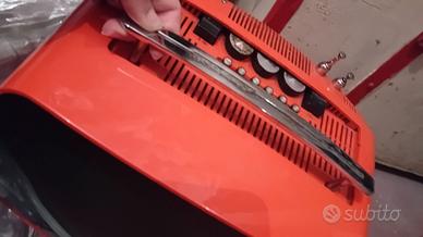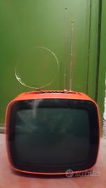 televisore rosso arancio forma cubo circa 35 cm marca Indesit modello T12 SI con sua antenna originale funzionante, maniglia acciaio a scomparsa, tasti dei canali e manopole a rondella nere e cromate con numeri, nemmeno un graffio. Da collezione. Ritiro a Roma euro 90
