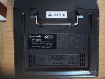 Televisore Roadstar 400N bianco e nero, 5 pollici, portatile, a transistor. Piccolo televisore portatile in materiale plastico nero, con schermo 5 pollici protetto da una lastra in plastica trasparente. A destra dello schermo si ha una rotella per l’accensione e la regolazione del volume. Sotto allo schermo si ha una scala di sintonia per bande VHF-L (canali 2-3-4), VHF-H (canali da 5 a 12), UHF (da 21 a 69), con una rotella per la sintonia e un deviatore per la scelta della banda. La parte superiore è sagomata per l’impugnatura. Nella parte superiore si ha un’antenna estraibile orientabile. Sul lato una griglia in plastica protegge l’altoparlante. Il retro è forato per l’aerazione e sono presenti un connettore per le antenne, una presa per corrente 230V 50Hz, una presa per batteria 12V. Fornita di cavo alimentazione.