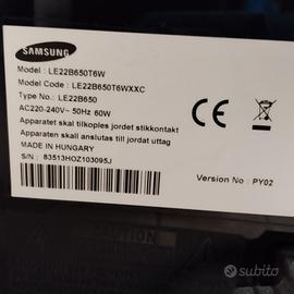 TV Samsung 22 pollici LE22B650T6W , con telecomando ATTENZIONE: Il televisore necessita di decoder estreno per lo standrd DVB-T2 digitale terreste. Prego contattarci In caso di richesta spedizione Specifiche prodotto: MarcaSamsung ModelloLE-22B650T6W | LE-22B650T6W Prodottotelevisori LinguaItaliano, Inglese Audio Sistema audioSRS TruSurround HD & Dolby Digital Plus Potenza in uscita (RMS)6 W Numero di altoparlanti2 Prestazione Televideo1000 pagine Funzione TelevideoSì Dati su imballaggio Peso (con supporto)5100 g Profondità (con supporto)189 mm Altezza (con supporto)404 mm Larghezza (con supporto)540 mm Peso (senza supporto)4800 g Larghezza (senza supporto)540 mm Profondità (senza supporto)63 mm Altezza(senza supporto)351 mm Caratteristiche di gestione On Screen Display (OSD)Sì Timer di spegnimentoSì Picture-in-PictureNo Timer on/offSì Connettività Uscita audio digitale ottico1 Numero prese Scart1 Uscite per cuffie1 S-Video in0 Ingresso video composito1 PC in (D-Sub)Sì Ingresso audio per PCSì Componenti video (YPbPr/YCbCr) in1 Quantità porte Ethernet LAN (RJ-45)1 Quantità porte HDMI1 Altre caratteristiche Accessori inclusiTM940 Orologio integratoSì Altoparlanti incorporatiSì Design Panel mounting interface 24/5000 Interfaccia per montaggio a pannello75 x 75 mm Colore del prodottoNero Display Tecnologia displayLCD Dimensioni schermo22 " Luminosità schermo300 cd/m² Risoluzione del display1366 x 768 Pixel Tipologia HDHD Rapporto d'aspetto nativo16:9 Gestione energetica Consumi40 W Consumi (modalità stand-by)1 W