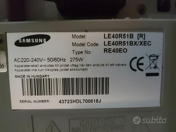 Tv lcd 40" (con decoder) mod.LE40R51B Risoluzione max. 1366x768 16:9 hd ready 75 hz Luminosità 500 cd/mq 8 ms Colore nero-argento dimensioni schermo L cm.98,9 x H cm.70,3 x P cm.11 dimensioni con piedestallo L cm.98,9 x H cm.76,3 x P cm.33,3