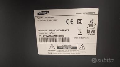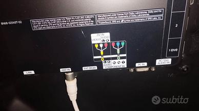 TV SAMSUNG 46'. Display in buone condizioni, nessun difetto. No smart TV. 2 porte USB, 3 HDMI, 1 DVI (vedere foto allegata per le connessioni). Anche se i canali si vedono quasi tutti (senza decoder esterno) consegno anche decoder (con i relativi cavi) acquistato per qualche canale non visibile a seguito del passaggio a DVB-T2 (come da foto). Telecomando originale come da foto. La base presenta qualche ammaccatura come mostrato in foto che non pregiudica la funzionalità. Consegna a mano.