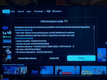 TQ75Q77CATXXC Diagonale schermo: 190,5 cm (75") Tipo HD: 4K Ultra HD Tecnologia di visualizzazione: QLED Forma dello schermo: piatto Proporzioni native: 16:9 Tecnologia di interpolazione del movimento: Motion Xcelerator Turbo+ Frequenza di aggiornamento nativa: 120 Hz Supporta la visualizzazione della frequenza di aggiornamento: 100Hz, 120Hz Numero di colori di visualizzazione: 1 miliardo di colori Risoluzione dello schermo: 3840 x 2160 Pixel Diagonale dello schermo: 189 cm sintonizzatore TV Tipo di sintonizzatore: analogico e digitale Formato del segnale digitale: DVB-C, DVB-S2, DVB-T2 Numero di sintonizzatori: 2 sintonizzatori Smart TV Smart TV: sì Internet TV: sì Sistema operativo installato: Tizen Versione del sistema operativo: Tizen™️ Smart TV Riproduzione dell'audio sullo schermo da un dispositivo mobile: sì Modalità intelligenti: risparmio energetico, modalità regista Mirroring domestico della TV: sì App video: Samsung TV Plus Audio Numero di parlanti: 2 Potenza stimata RMS: 20 W Canali di uscita audio: 2.0 canali Subwoofer integrato: no Descrittore delle preimpostazioni audio: sì Q-Sinfonia: sì Parete musicale: sì Amplificatore vocale attivo (AVA): sì Suono adattivo+: sì Multisala: sì Tecnologia audio multiroom o sistema audio multizona: Samsung Multiroom Link Canale di ritorno audio avanzato (eARC): sì Connessione Wi-Fi: sì Ethernet: sì Standard Wi-Fi: 802.11a, 802.11b, 802.11g, Wi-Fi 4 (802.11n), Wi-Fi 5 (802.11ac) Bluetooth: sì Versione Bluetooth: 5.2 Navigazione: sì Browser Web: sì