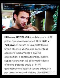 Causa non utilizzo, ma usato veramente poche volte, vedi telecomando intatto nella numerazione, mod HISENSE H32m2600, smart collegabile internet, è montato su staffa, così si può vedere in funzione, e in tal caso sganciare per essere ritirato, consegna a mano cagliari zona San Michele.
