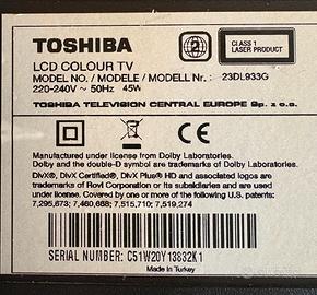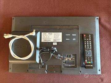 ATTENZIONE PUO' ESSERE MONTATO SOLO A PARETE ! TELECOMANDO NON ORIGINALE! Ritiro solo a mano in zona Milano Sud Villaggio olimpico Il Toshiba 23DL933G è un televisore LED compatto da 23 pollici (58 cm) che si distingue per l'integrazione di un lettore DVD incorporato, rendendolo una soluzione ideale per spazi ridotti come cucine, camere da letto o camper. LCD Compare LCD Compare +1 Caratteristiche Principali Display: Schermo LCD con retroilluminazione Edge-LED e risoluzione Full HD (1920 x 1080 pixel). Lettore Integrato: Include un lettore DVD/CD situato lateralmente. Qualità Immagine: Supporta la tecnologia Active Motion Rate 100 (AMR 100) per una maggiore fluidità delle immagini in movimento e riduzione del rumore digitale. Sintonizzatore: Dotato di decoder integrato per il digitale terrestre (DVB-T) e cavo (DVB-C). Connettività: 2 ingressi HDMI. 1 porta USB con funzione media player (foto, musica e video) e registrazione PVR. Ingresso PC (VGA), SCART e ingressi component/compositi.