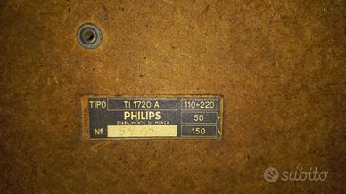televisore a valvole Philips TI 1720 A anno 1953 fabbricato in Italia a Monza originale e completo in ogni sua parte tutte le valvole presenti tubo intatto cassa in legno non sciupata unica rottura (senza mancanza di parti e riparabile) pannello di copertura retrostante: Materiale legno plastica (bachelite) vetro e metalli, completo di cavo di alimentazione 220V originale con spina. Splendido pezzo da arredamento già presente in musei. Di provenienza familiare (nonni) riposto in soffitta per passaggio a modello nuovo negli anni 70 (quindi probabilmente funzionante!!!??? ma ovviamente non provato ad accendere) dimensioni circa cm 60x55x50 tubo da 17 pollici peso circa 30Kg. Data la delicatezza e fragilità del pezzo non spedisco. Ritiro solo a mano ad Arezzo città pagamento sul posto alla consegna.