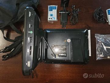 Doppio ( n°2 ) tv monitor ( marca D-jix ) portatili ( da viaggio ) da sorgenti quali DVD,usb,memorie ecc... ( caricabatteria sia da auto che da casa ) completi di attacchi e tutto l'occorrente per utilizzarli in auto camper ecc sia in modo singolo o in coppia ( si può vedere lo stesso film sui due monitor oppure vedere due film diversi ) .....io lo ho acquistati per tenete impegnati i ragazzi durante i viaggi in macchina......per ulteriori informazioni o domande.....contattami saluti