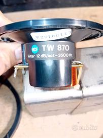 Tweeter 80mm diametro circa con filtro passa alto incorporato , woofer da 130mm con cono in fibra di carbonio .