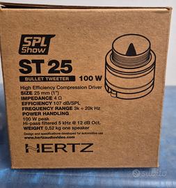 Vendo per non utilizzo Bellissimi tweeter Hertz SPL SHOW ST 25 tenuti bene con condensatori originali e scatola.. potenza massima 100 w prodotto di sicura affidabilità PREZZO TRATTABILE NO PERDITEMPO!!