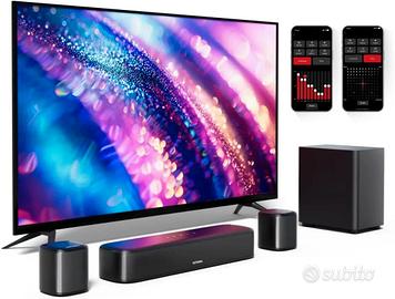 Il sistema include una soundbar compatta, subwoofer cablato da 4 pollici e due speaker surround wireless da posizionare liberamente (perfetti in spazi da 10 a 20 m²). Grazie alla tecnologia SurroundX e BassMX, puoi personalizzare l’esperienza audio scegliendo fra 121 preset EQ tramite l’app smart ULTIMEA, che ti permette anche di regolare alti, medi e bassi con un equalizzatore a 10 bande.