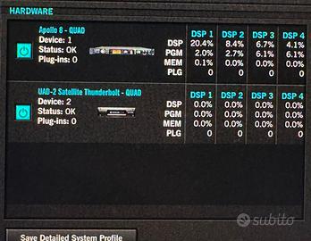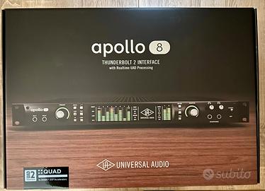Universal Audio - APOLLO 8 Black QUAD - SATELLITE UAD2 QUAD - PLUGIN UAD In vendita scheda audio con aggiunta di DSP esterno e tanti plugin UAD. Con scatole originali e cavi Thunderbolt di collegamento (n.2 cavi). Condizioni come nuove. UNIVERSAL AUDIO - APOLLO 8 Black - QUAD Core - Thunderbolt 2 4 pre amplificatori 8 canali In condizioni ottime, come nuova. ------- SATELLITE UAD 2 Quad core DSP DESKTOP Thunderbolt 2 con 4 processori Shark In condizioni ottime, come nuova. ------- Includo inoltre bellissimi plugin UAD: Ampex ATR-102 Mastering Tape Recorder Studer A800 Multichannel Tape Recorder 1176LN & SE Legacy 1176SE Legacy Classic Limiting Amplifier Ampeg SVT-VR Classic Bass Amp Ampex ATR-102 Mastering Tape Recorder (UAD DSP) API Vision Channel Strip Precision Mix Rack Collection Precision Enhancer Hz Fairchild 670 Legacy Compressor Helios Type 69 Legacy EQ Ibanez Overdrive Teletronix LA-2A Legacy Classic Leveling Amplifier Lexicon 224 Digital Reverb (UAD DSP) Marshall Plexi Classic Amplifier Massenburg MDWEQ5 Parametric EQ Neve 1073 / 1073SE Classic Console EQs Neve 1073 Preamp & EQ Collection (UAD DSP) EMT 140 Classic Plate Reverberator Pultec EQP-1A Legacy Pultec Legacy EQs Raw Distortion RealVerb Pro Custom Room Modeler Softube Half Stack Amp Room Softube Bass 8x10 Amp Room Studer A800 Tape Recorder TS Overdrive 1176 Classic Limiter Collection UA 610-B Tube Preamp and EQ Lexicon 224 Digital Reverb Neve 1073 Preamp & EQ Collection 1176 Classic Limiter Collection A disposizione per informazioni.