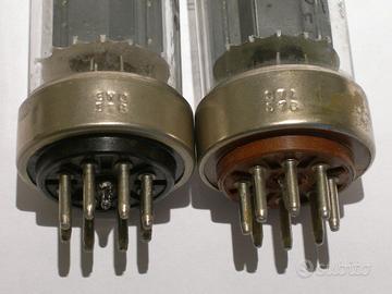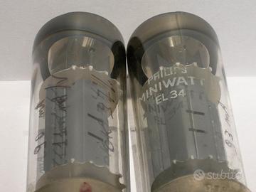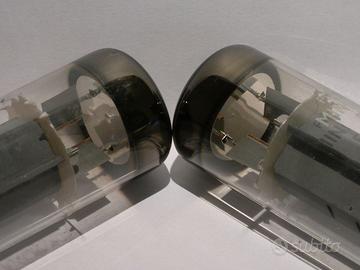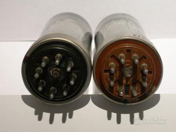 Coppia di EL34 Metal base. Come si può notare dalle foto i pin guida sono rotti, le valvole sono ancora buone, una testa 90 mA, l'altra 93 mA, efficienza 97/100%.