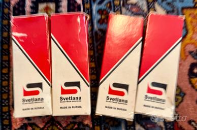 Vendo magnifico quartetto di valvole EL34 Svetlana S-Logo originali del 2002, lotti di produzione consecutivi, produzione originale russa (fabbrica di San Pietroburgo), complete di scatole originali. Queste valvole sono famose tra gli audiofili e i chitarristi per la loro robustezza e per quel tipico "suono europeo" caldo, dettagliato e con medie frequenze armonicamente ricche, superiori alla produzione moderna standard. Valvole in condizioni eccellenti, facevano parte della dotazione d'un mio vecchio ampli Jolida JD302 Codici Data/Lotto: 0246 – 0247 – 0247 – 0251 (Produzione anno 2002). Non vanno confuse con le attuali produzioni ri-marchiate. Queste valvole risalgono a un periodo d'oro della produzione russa post-sovietica, dove il controllo qualità era ai massimi livelli.