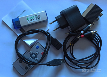 Presenta una pendrive USB da 4GB che tramite appositi cavi, inclusi nella confezione, consente il collegamento alla TV per riprodurre sulla TV audio o video caricati sulla USB.