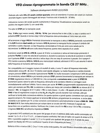 VFO cinese NUOVO ampiamente riprogrammato. Per baracchini fino a 23 canali per estenderne il numero dei canali e/o risolvere problemi legati a quarzi danneggiati dal tempo. VFO simili normalmente in vendita non fanno nulla di ciò che è scritto qui sotto, quelli generano solo la frequenza del display, o piu 455 kHz. Indicazione canale quando in frequenza. Visualizzazione numerazione canali a partire da canale 1, con canali alpha, sotto l’uno i canali sono numerati negativi. Due Frequenze commutabili e memorizzate (VFO A, VFO B, A/B in dual watch alternato). Scansione da VFO A a VFO B a passi di 10 kHz, 5 kHz. Tre velocità di scansione, commutabili con il pulsante STEP durante la scansione . La scansione si attiva ed interrompe premendo il pulsante TX/RX. Salvataggio VFO A e VFO B dopo spegnimento. Tre valori di step. Step: 5 kHz (ogni mezzo canale). 250 Hz, 10 Hz (per sintonia fine in AM e SSB) commutabili con il pulsante STEP. Quando si torna ai 5 kHz la frequenza viene arrotondata ai 5 kHz interi più vicini. Con batteria a ricarica USB. Per compatibilità con il maggior numero di modelli di radio ci sono 15 tipologie di sintesi a quarzo selezionabili dall’utente, inclusa IF=0 cioè frequenza visualizzata (vedi foto 4, 5 e 6). Taratura fine IF a step di 1Hz separata RX e TX (fino a 1 MHz), perciò si può usare anche con apparati a 1, 3, 6, 12 canali. Settare Radio su Canale 1. Solo per la sintesi con quarzi a 37 MHz, la più diffusa negli apparati AM, è possibile selezionare qualsiasi canale sulla radio, gruppo di quattro, il display indica quale. Circa 1 V rms uscita onda quadra, filtrata a sinusoidale dalla radio. il VFO va connesso al posto dei quarzi del gruppo di 6, Usato con successo su radio solo AM e AM SSB. Nota bene: solo per CB a 23 canali (vintage). Quelli a 40 o più canali sono a sintesi PLL e non sono compatibili con questo VFO. Per utilizzare un VFO è necessario modificare il baracchino e per farlo serve competenza tecnica che non è inclusa.