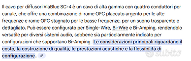 Cavo di Potenza Viablue SC4 composto da 4 conduttori in puro rame OFC, 2 dei quali placcati argento, da dedicare alla gamma alta, e i restanti 2 stagnati, da dedicare alla gamma medio-bassa.
