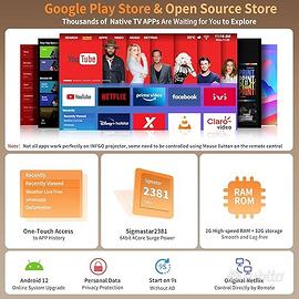 proiettore portatile con tv android 12 con app Netflix, Prime Video YouTube ecc. Connessione di rete LAN/interfaccia HDMI ad alta definizione/interfaccia dati USB 3.0/interfaccia audio digitale SPDIF/jack per cuffie