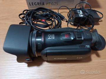 videocamera Canon HF G25, completa di scatola, cavi, caricabatterie, batteria. In più regalo microfono professionale rode (costa 150 euro) che si è tolto il tastino dei decibel ma funziona super.
