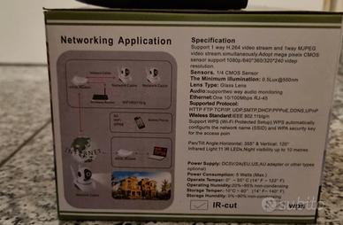 Articolo Visionspot, videocamera da interno Wifi con panoramica a 360°. Consente di comunicare da esterno e interno con i membri dell'abitazione. Rilevazione di ogni minimo movimento di giorno e anche di notte con i raggi infrarossi, alta risoluzione per riprendere fino a 10m di distanza e registrazione del suono col microfono incorporato. Possibilità di inserire una MicroSD sulla testa della videocamera. Il tutto gestito dall'applicazione installata sul cellulare tramite il Qr Code che trovate sul libretto di istruzioni. Completa di cavo di alimentazione, supporto/viti da parete(non per forza utilizzabili). Con confezione originale. Nuovo.