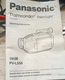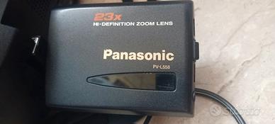 Videocamera vintage Panasonic modello PV-L558 con cavi e borsa (non originale). Funziona perfettamente. La batteria non regge, munita di riduttore per collegamento rete elettrica, due minicassette, batteria (una non regge carica), libretto manutenzione; caricabatteria, alimentatore di rete