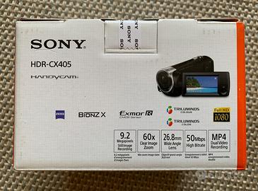 SONY Handycam HDR-CX405 dotata di un sensore CMOS Exmor R ,obiettivo grandangolare Carl Zeiss con zoom ottico 30x.Acquisizione video Full HD display LCD da 2,7".CONFEZIONE ORIGINALE : Handycam HDR-CX405 di Sony ,Batteria ricaricabile agli ioni di litio NP-BX1/M8 di Sony (3,6 V, 1240 mAh) ,Scheda MicroSD 32 GB,Adattatore CA, Cavo Micro-HDMI,Cavo di supporto alla connessione USB,borsa tracolla,MAI USATA.