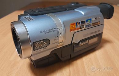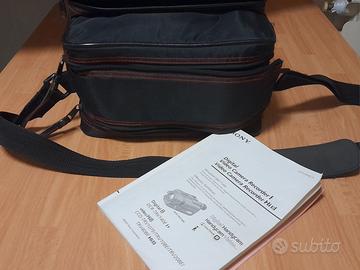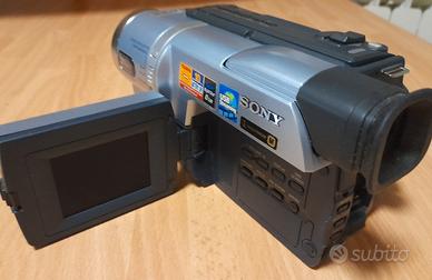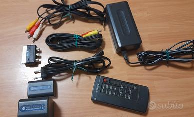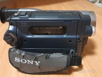 Videocamera Sony Digital8 modello DCR-TRV140E recorder, telecomando (alimentato con due batterie stilo non incluse), trasformatore CA ACL10A, cavo di alimentazione, cavi di collegamento A/V monofonico e stereo, blocco batteria NP-FM30 più una batteria di ricambio, adattatore a 21 piedini, manuale d'istruzione e borsa per il trasporto. Videocamera perfettamente funzionante solo la maniglia di stoffa per impugnare la videocamera è rovinata. Numero di serie 60242