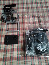 Camera sportiva con custodia impermeabile. Waterproof 30M, IP68, schermo 2", video HD 720p/30fps, batteria ricaricabile, connessione USB.