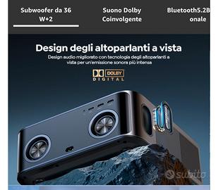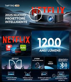 Videoproiettore NUOVO, solo provato, mai usato. Qualità eccezionale. Audio dolby atmos Ancora imballato, nessun difetto. Luminosità: 1200ANSI (36000 lumen); Risoluzione originale: 1080P Full HD, supporta 4K; Rapporto di contrasto: 300000:1; Altoparlanti esposti da 36 W, Dolby Audio; Netflix ufficiale, oltre 20.000 app certificate integrate; Messa a fuoco automatica, correzione trapezoidale automatica, evitamento automatico degli ostacoli e input automatico su schermo; WiFi6 e Bluetooth 5.2 bidirezionale; Zoom 50%-100%