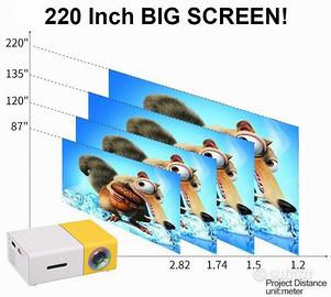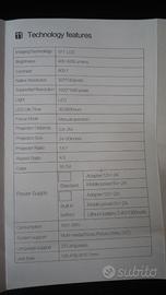 Videoproiettore lampada LED 30.000 ore risoluzione 1920x1980 pixel; supporta multimedia audio, foto, video; connessione diretta con cellulare, hdmi, schede microSD,telecomando, cavi connessioni, adattatore 12V-2A. Super nuovo, cedo causa doppione. Pratico e portatile, tascabile.Dimensioni 126x83x47 mm