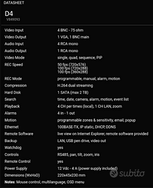 Dvr 4 canali perfettamente funzionante (caratteristiche in foto). Vendo per passaggio a dvr con più canali. (Telecamere in foto già vendute)
