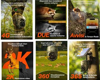 Telecamera PTZ 2K per la fauna selvatica con scheda SD e SIM, vista completa a 360 gradi, trasmissione in diretta, infrarossi invisibili, visione notturna, attivazione con il movimento, impermeabile IP65.