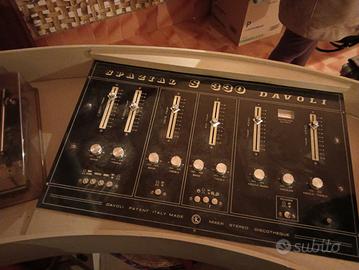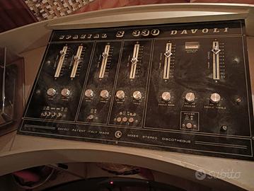 Mixer DAVOLI 330. Raro esemplare vintage italiano degli anni '70–'80. Apparteneva al mio nonno. nella taverna aveva ricreato una sala da ballo per le figlie all'epoca adolescenti. 6 canali microfonici (MICRO 1–6), 2 ingressi per giradischi (DISCO 1–2) RADIO e AUX per sorgenti esterne ALTOPARLANTI per diffusione audio REGISTRAZIONE per output verso registratori Manopole e slider per mixaggio, equalizzazione e routing dei segnali. Cedo ovviamente con relativo mobilio.