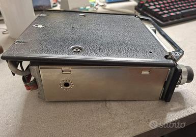 L'apparecchio è la versione estraibile, un vero status symbol dell'epoca, completa della sua preziosissima custodia originale in pelle marrone con interni protettivi, utilizzata per trasportare l'autoradio fuori dal veicolo.