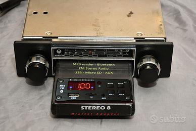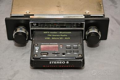 Per la tua auto d'epoca, un pezzo della storia dell'HI-Fi in auto, aggiornato alle ultime tecnologie. Questa autoradio VOXSON Sonar GN 108, unitamente alla sua cassetta digitale Stereo 8, permette ore ininterrotte di musica grazie al lettore di micro SD o pennetta USB, al collegamento bluetooth od alla radio FM Stereo. A titolo indicativo, sulla scheda Micro SD da 32 Gb, che viene fornita insieme al Sonar, alla cartuccia ed al telecomando, possono essere inseriti più di diecimila brani musicali in MP3. La maggiore limitazione dello Stereo 8, vale a dire l'impossibilità, per i più, di registrare i propri nastri, è oggi finita. Potrete riversare sulla pennetta USB o sulla micro SD Card la musica più adatta per ogni occasione. Ogni autoradio è modificata per interfacciarsi esclusivamente con la propria cartuccia digitale. La modifica apportata non permette quindi la lettura dei vecchi nastri Stereo 8, né l'ascolto della radio AM. Video dimostrativo disponibile su Youtube. Prova e ritiro a Roma zona Colli Aniene. Ignoro ribassisti e perditempo. Spedizione gratis in Italia.
