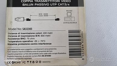 Questi dispositivi sono progettati per la trasmissione di segnali video e alimentazione su cavo UTP Cat. 5 o superiore, e sono comunemente usati in sistemi di videosorveglianza (TVCC). Le informazioni tecniche riportate sulla confezione includono: