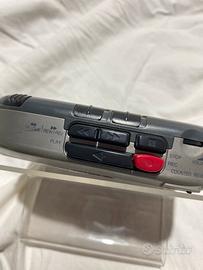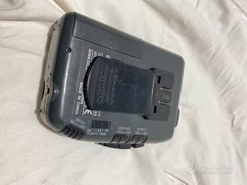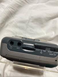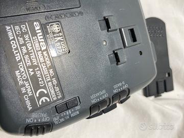 Walkman (lettore portatile di musicassette e radio AM/FM) Aiwa, con funzioni di: REGISTRATORE; selezione cassetta normal/metal; contatore; ascolto esterno; pausa; extra bassi; indicatore di carica. Alimentazione a batterie 2xAA o trasformatore DC 3v. Dotato di linguetta estraibile per l’aggancio alla cintura dei calzoni. Disponibile microfono stereo originale con clip (cosiddetto “lavalier”) per l’aggancio al colletto degli indumenti.