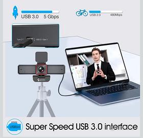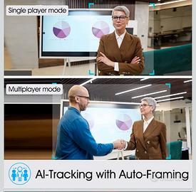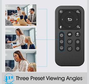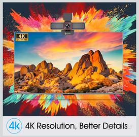 Webcam Angetube 4K per streaming con AI Tracking e HDR. - Doppio microfono con cancellazione del rumore. - Modalità specializzate per riunioni, conferenze e live streaming. - Connessione USB 3.0. - Include telecomando.