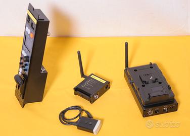 - Trasmettitore dati, alimentato tramite adattatore di alimentazione esterno 12 Vdc (incluso) o batterie V-lock