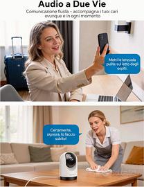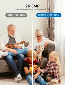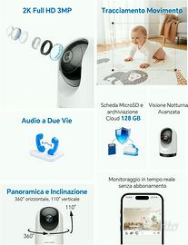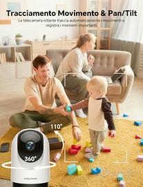 WOLFANG WS03 Confezione 2 Telecamere di Sicurezza WiFi Interna 2K 3MP, PTZ 360° con Tracciamento Automatico, Audio Bidirezionale, Visione Notturna, Compatibile con Alexa & Google Home NUOVO SIGILLATO LISTINO 50€ Risoluzione 2K 3MP Ultra HD & Visione Notturna IR】Questa telecamera di sicurezza interna offre una risoluzione 2K 3MP per video nitidi e dettagliati. La visione notturna a infrarossi integrata garantisce una sorveglianza chiara anche al buio totale, ideale per casa, cameretta e animali domestici. 【Rotazione 360° / 110° & Tracciamento Automatico】Con rotazione orizzontale a 360° e verticale a 110°, la telecamera assicura una copertura totale senza angoli morti. Segue automaticamente persone e oggetti in movimento in tempo reale. 【Audio Bidirezionale & Condivisione fino a 4 utenti】Dotata di microfono e altoparlante integrati per una comunicazione a distanza fluida. La telecamera supporta la condivisione con fino a 4 utenti, permettendo a tutta la famiglia di sorvegliare la casa. 【Rilevamento Movimento Intelligente & Notifiche Istantanee】L’avanzato rilevamento movimento invia notifiche in tempo reale al tuo smartphone. Puoi visualizzare il live stream immediatamente e rispondere prontamente ai rischi potenziali. 【Doppia Memoria & Controllo Vocale con Protezione 24/7】Supporta la memoria cloud (prova gratuita 14 giorni) e scheda microSD fino a 128GB (scheda non inclusa). Compatibile con Alexa e Google Home per un semplice controllo vocale.