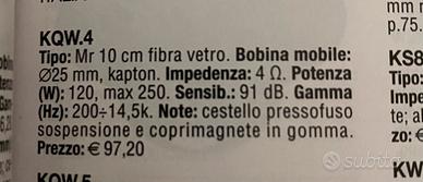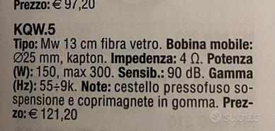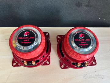 Vendo perfettamente funzionanti N.1 coppia di woofer killer line KW4 10cm 100mm 4ohm 25€ N.1 coppia woofer killer line KQW5 13cm 130mm 4ohm 30€ Caratteristiche in foto rivista acs Consegna a mano, no spedizione Come ciare audison hertz alpine impact phonocar kenwood focal ground zero gme