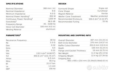 4 woofer Eighteen sound 15MB1000 bobina da 4" caratteristiche in foto prezzo 700 euro per il blocco
